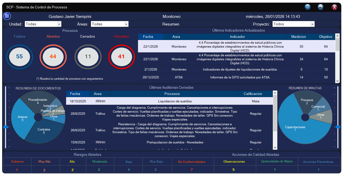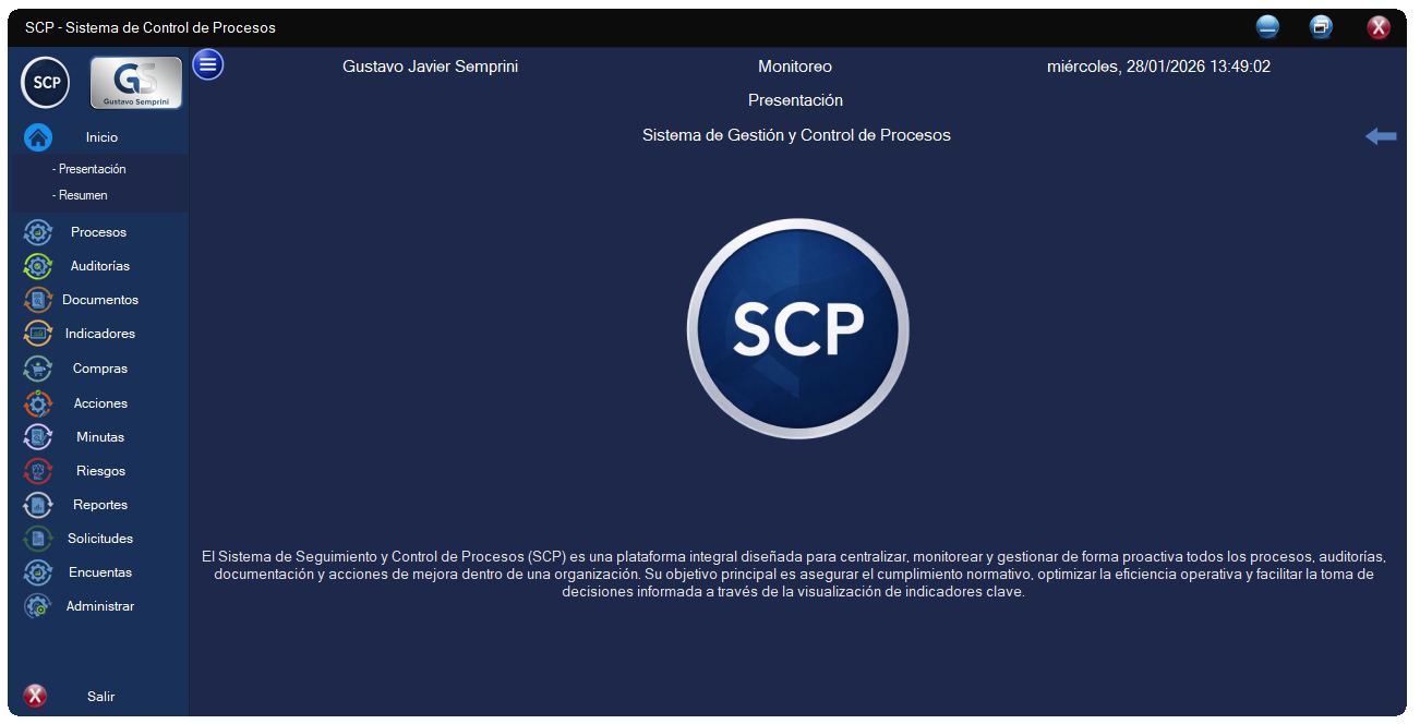 Módulo de Inicio: Ofrece una presentación ejecutiva de cada módulo y un resumen general detallado de todos los procesos bajo control.